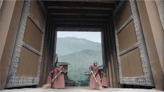 수상하게끔 성문을 열고 빗자루질을 하고 있는